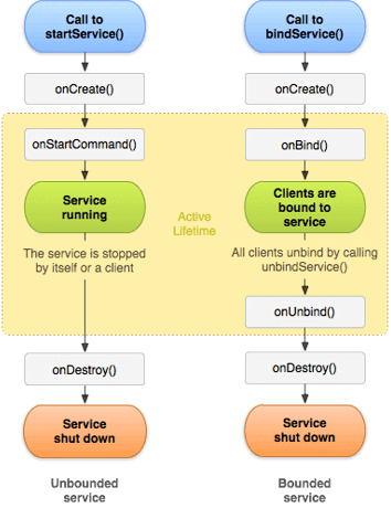 An Android service has a life cycle; it is known as lifecycle callback methods. The developer can implement this lifecycle callback method to keep a watch on any changes that the service state goes through. Monitoring this will aid you to perform work on this at the appropriate stage and time. The image below illustrates the lifecycle of an Android service. It shows both the method of creating a service. Through startService() and bindService().